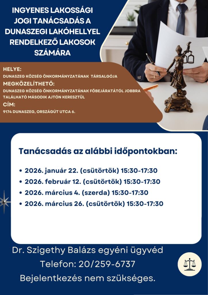 Márciusban (2026.03.04-én) újra díjtalan jogi tanácsadás a dunaszegi lakóhellyel rendelkező lakosok számára.