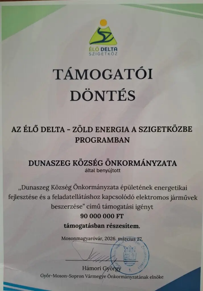 Örömmel tájékoztatom Dunaszeg Község lakosságát, hogy településünk sikeresen pályázott az „Élő Delta – Zöld Energia a Szigetközbe” programban és bruttó 90 000 000 Ft támogatást nyert!